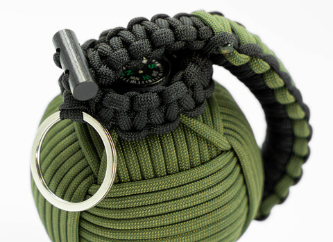 Each Bug Out Frag hand wrapped by our team of knot tying experts here in Huntington Beach California, made using 45' of high quality, USA Made Commercial Grade Type III Paracord, making the Bug Out Frag one of the most generous in terms of supplied cordage. Inside the grenade shape is an integrated survival kit packed in a rugged, water tight spherical case that will withstand abuse while in the field. Each kit contains necessary tools for fire starting, camp craft, trapping, fishing, signaling, and purifying water (complete list below).